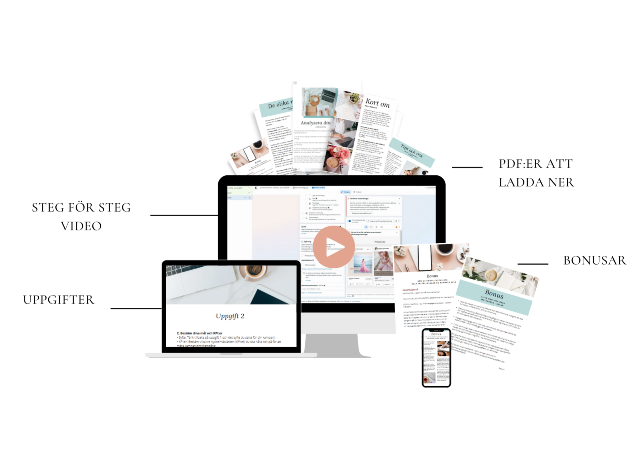 Kursen är för dig som är ny på annonsering eller som vill fräscha upp dina kunskaper, även om du känner dig som den mest otekniska personen på planeten. Den går igenom hur du annonserar på Meta (Facebook och Instagram) i steg-för-steg videos, PDF:s och extra tips, för att du ska känna dig trygg och frigöra mer tid till det du älskar